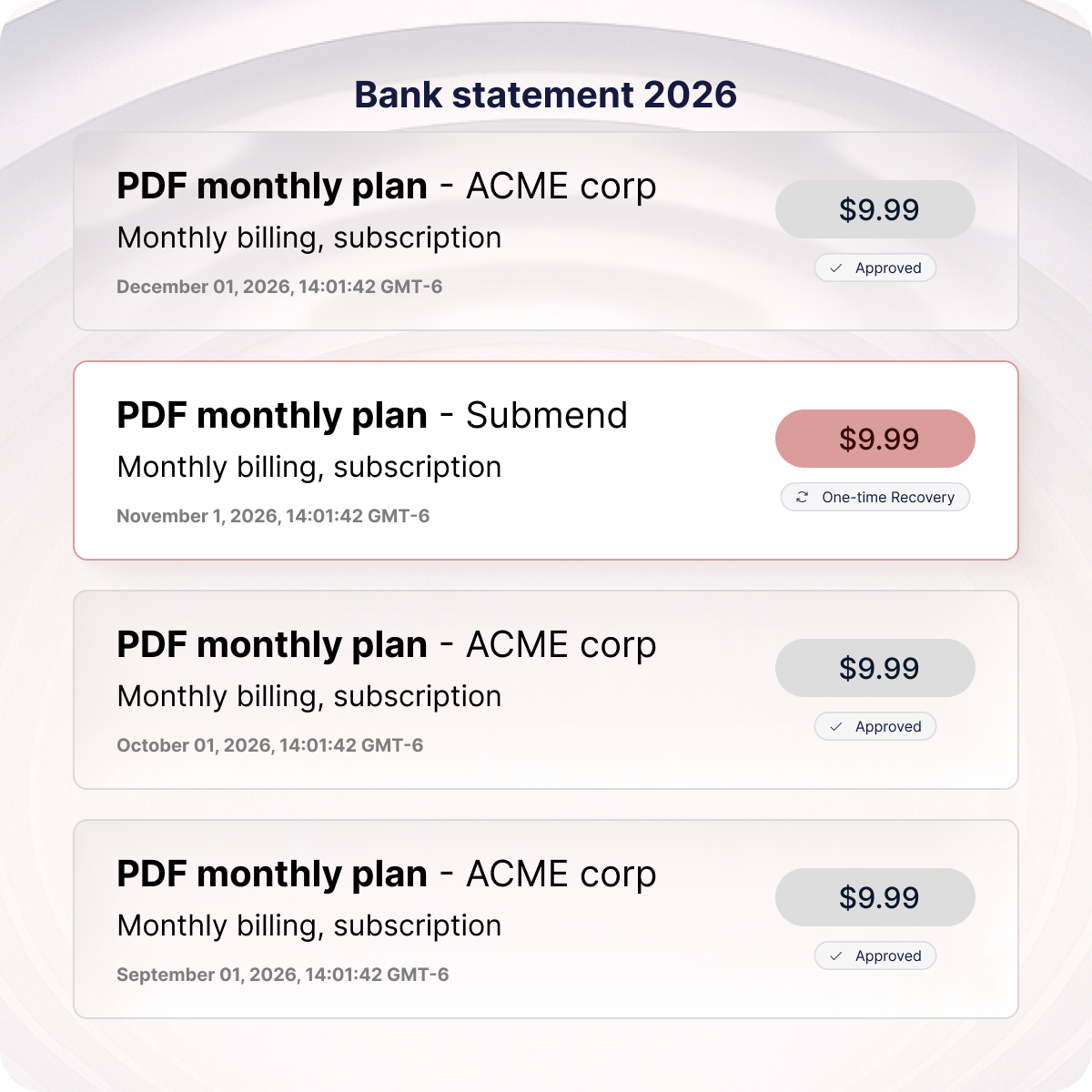 Submend focuses on recovering individual subscription-payment attempts that fail due to temporary authorization issues. Each retry is treated as a single, standalone transaction and is processed only upon successful approval, ensuring clean recovery without altering the merchant’s existing billing logic.